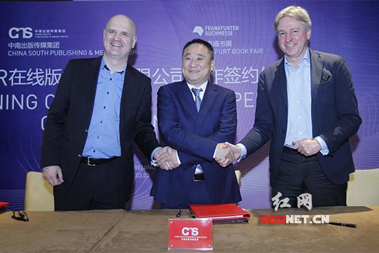 法蘭克福書展主席尤根·博斯,法蘭克福書展副主席、IPR在線版權交易有限公司總裁托馬斯·明庫斯,湖南出版投資控股集團黨委書記、董事長、中南出版傳媒集團董事長龔曙光共同簽署了合作協議。